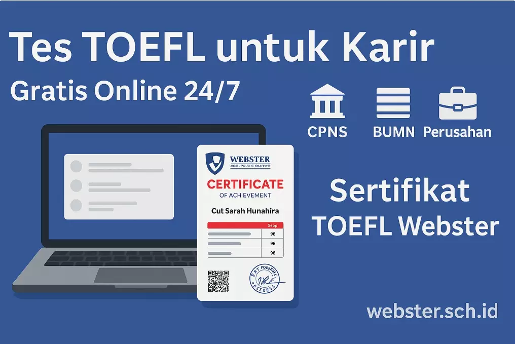 Tes TOEFL untuk Karir Gratis, Online 24/7, dan Bersertifikat Webster (SK Diknas & NPSN)
