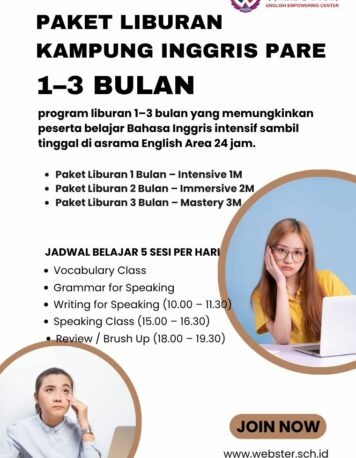 LKP Webster Kampung Inggris Pare menyelenggarakan Paket Liburan Kampung Inggris Pare 2025, yaitu program liburan 1–3 bulan yang memungkinkan peserta belajar Bahasa Inggris intensif sambil tinggal di asrama English Area 24 jam. Program ini dirancang khusus bagi pelajar, mahasiswa, lulusan baru, hingga peserta gap year yang ingin liburan produktif sekaligus meningkatkan kemampuan Bahasa Inggris secara cepat dan terarah.